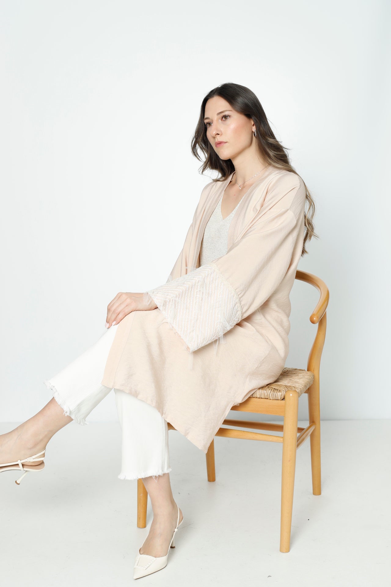 La collection Terra, inspirée par les teintes chaleureuses de la terre, vous transporte dans un univers de naturel et d'élégance. Chaque kimono, minutieusement conçu, allie confort et style. Les motifs imprimés et les bandes de sequins sur les bras ajoutent une touche de raffinement unique.