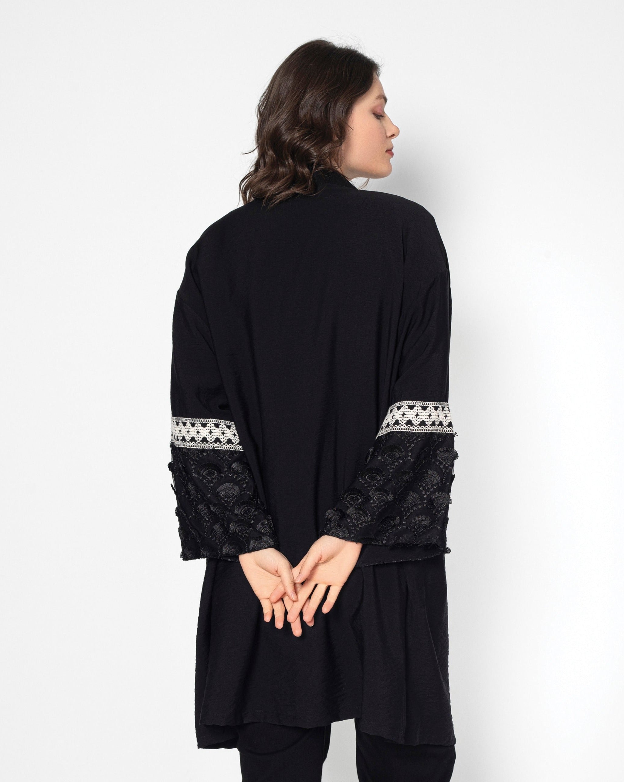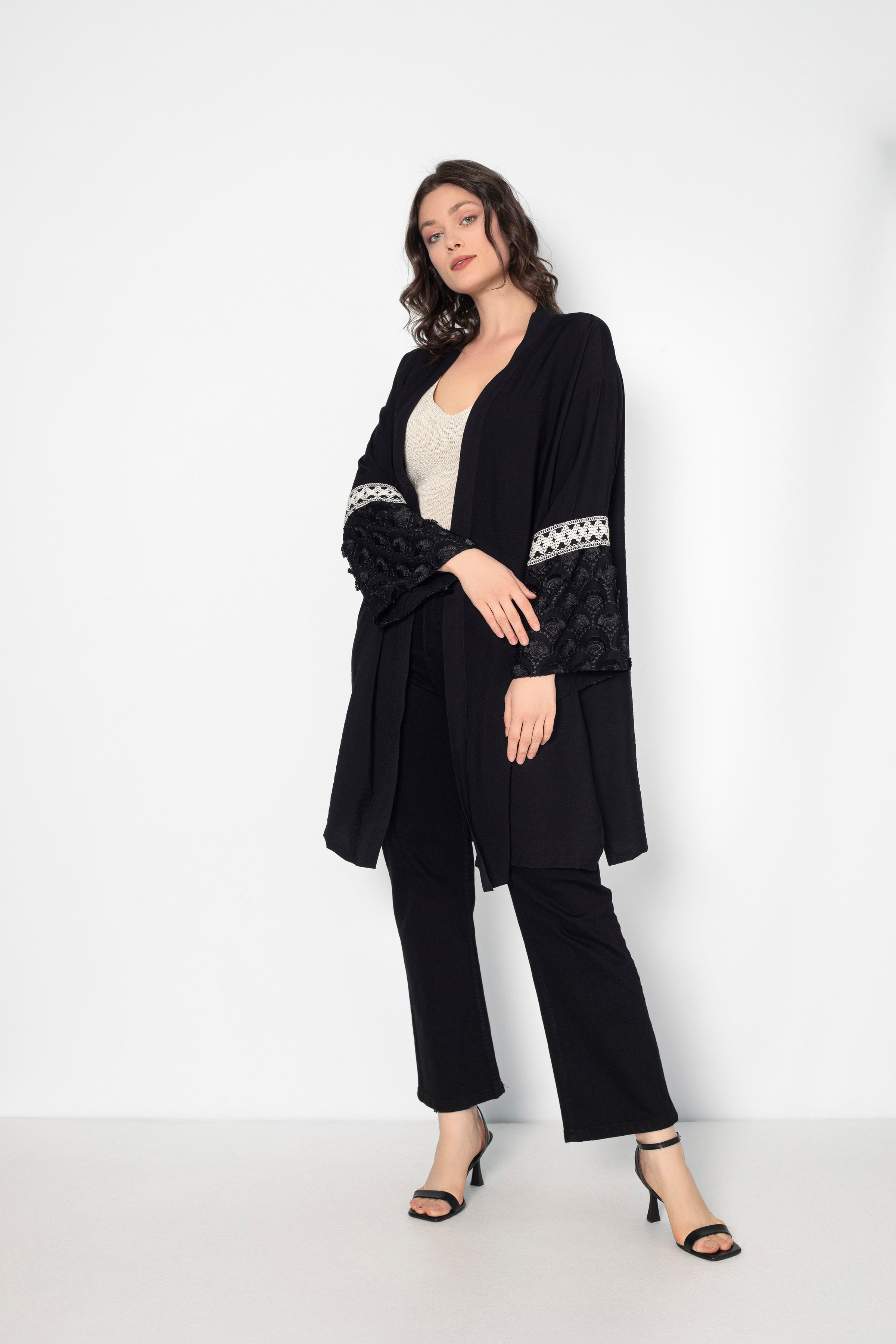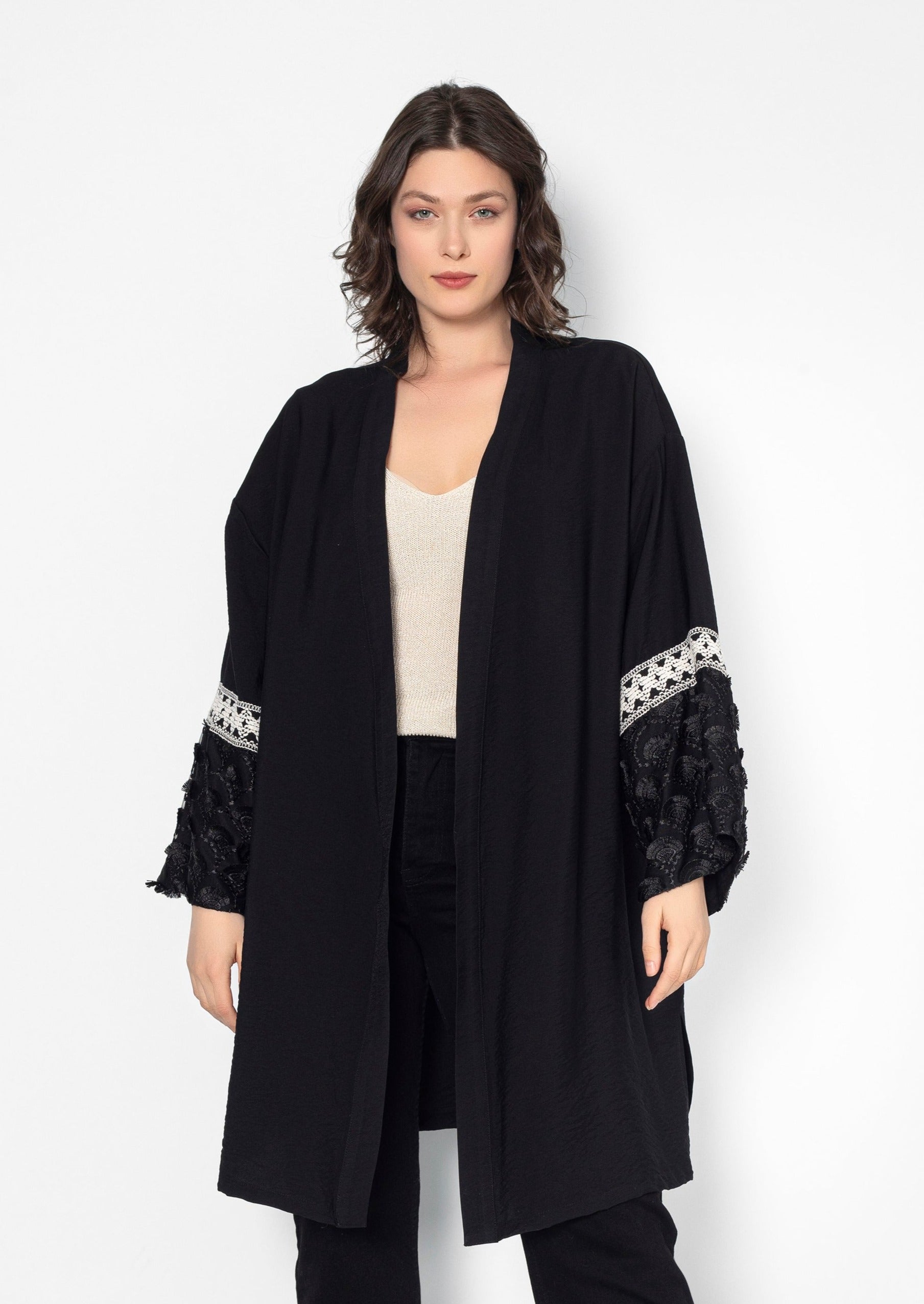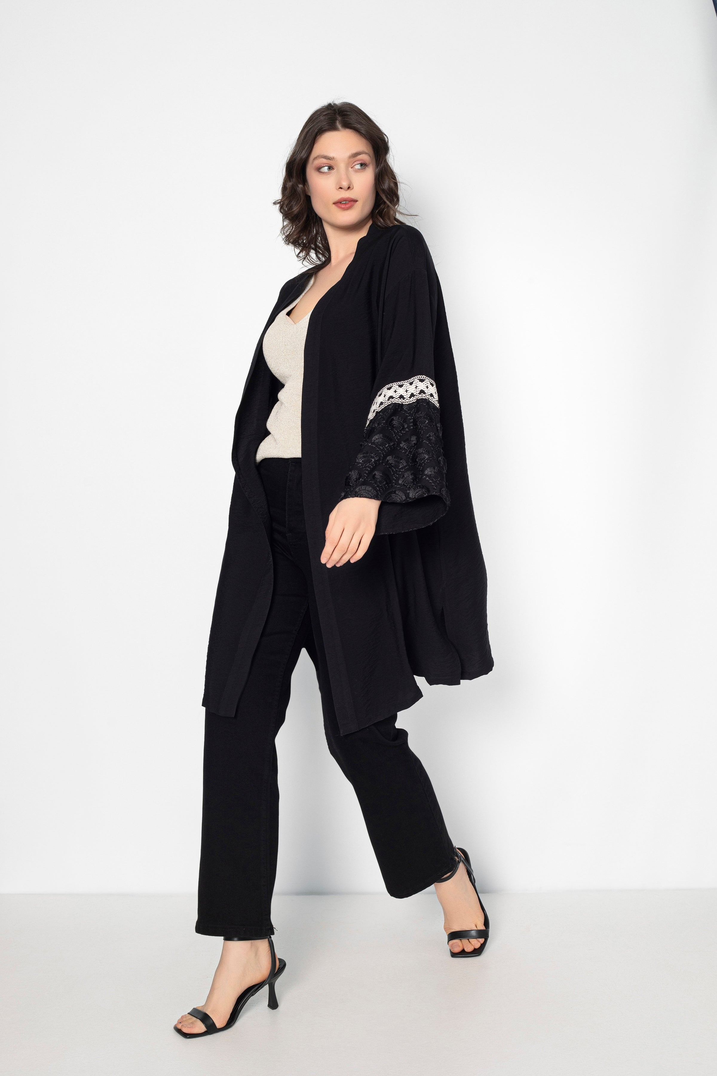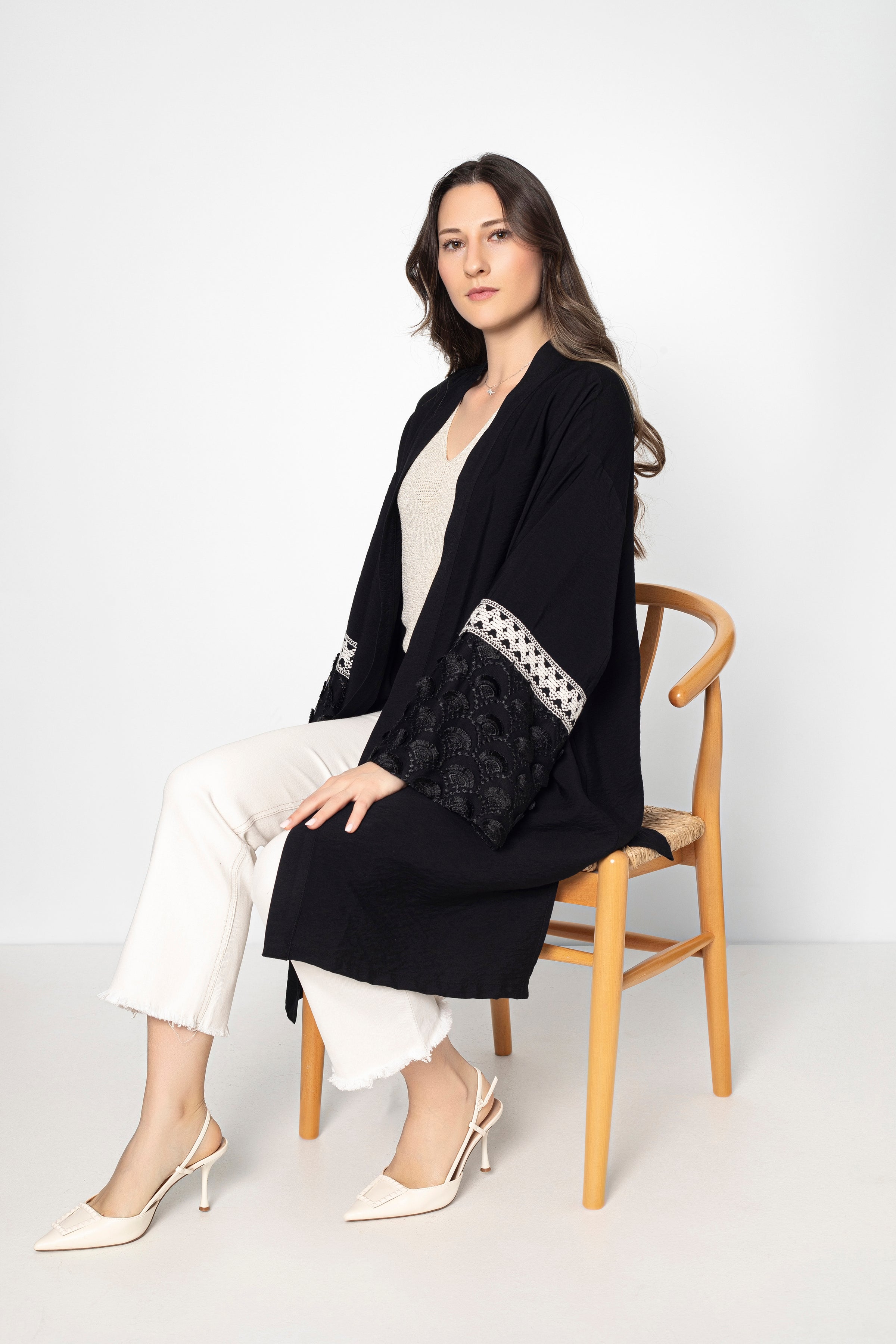 Découvrez l'élégance intemporelle avec notre kimono Maya, orné de manches brodées inspirées des plumes et d'une broderie ethnique en noir et blanc.