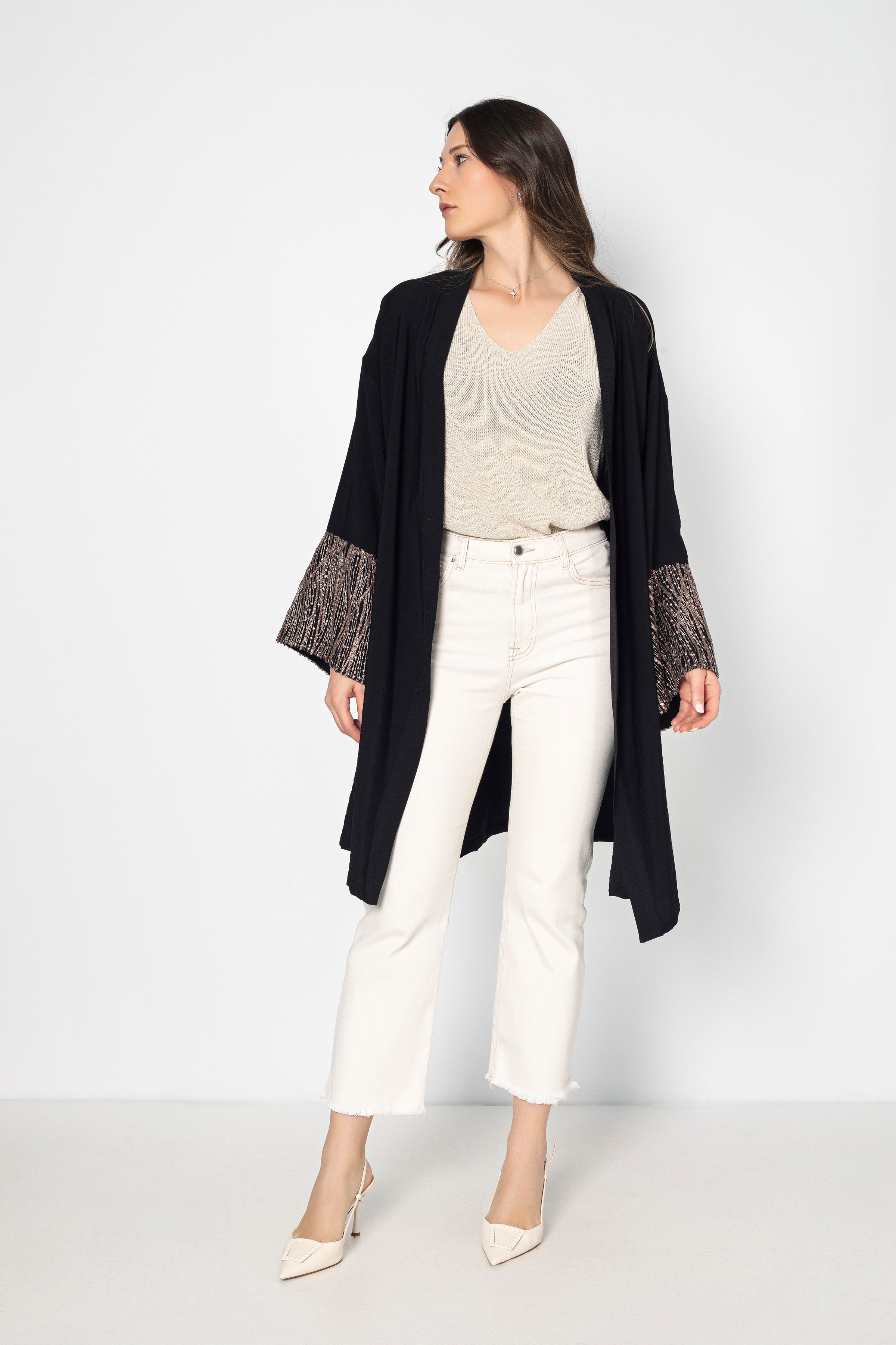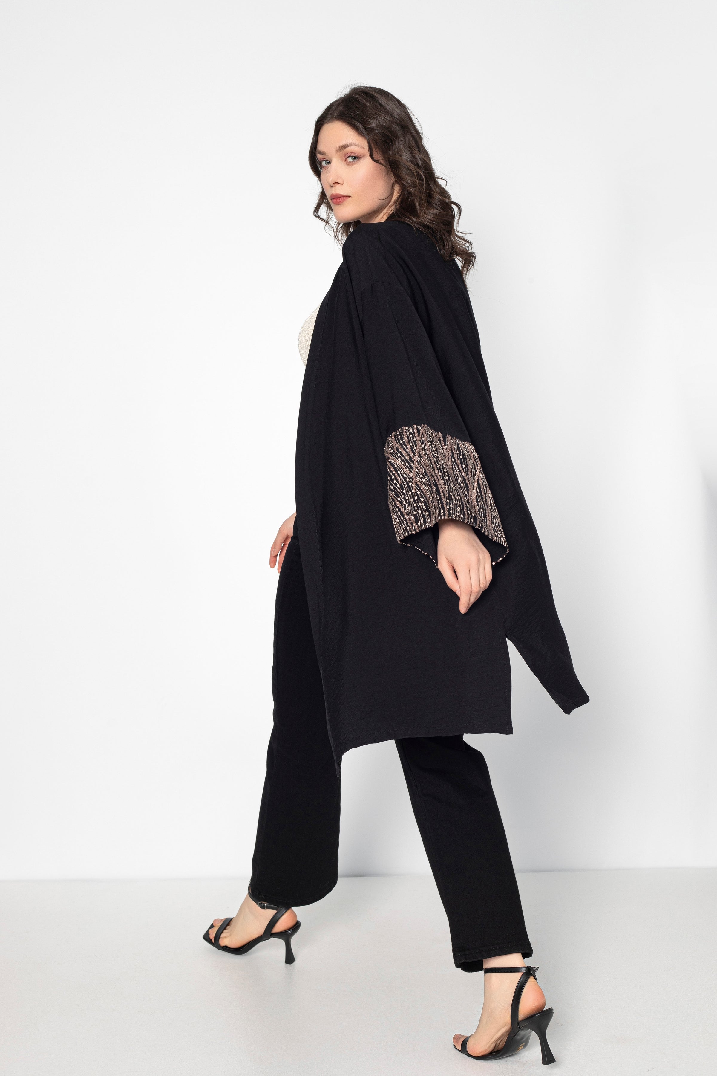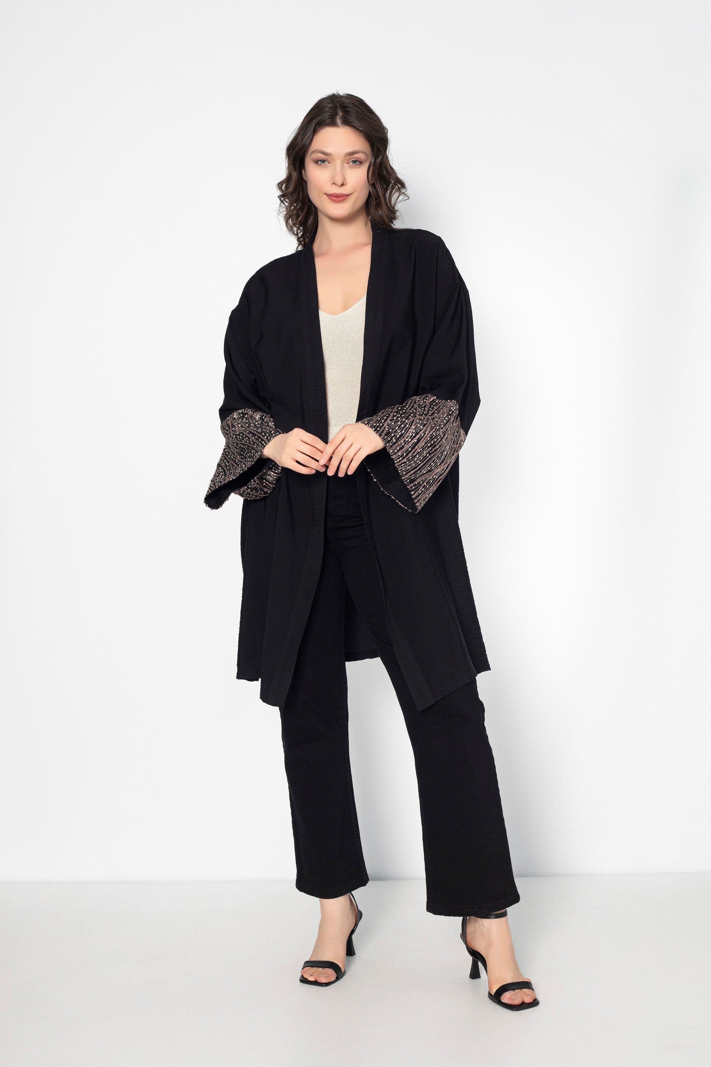 Plongez dans l'élégance intemporelle avec notre kimono Aurora haut de gamme, mettant en vedette des manches rosées délicates, rehaussées de touches de sequins sublimes.