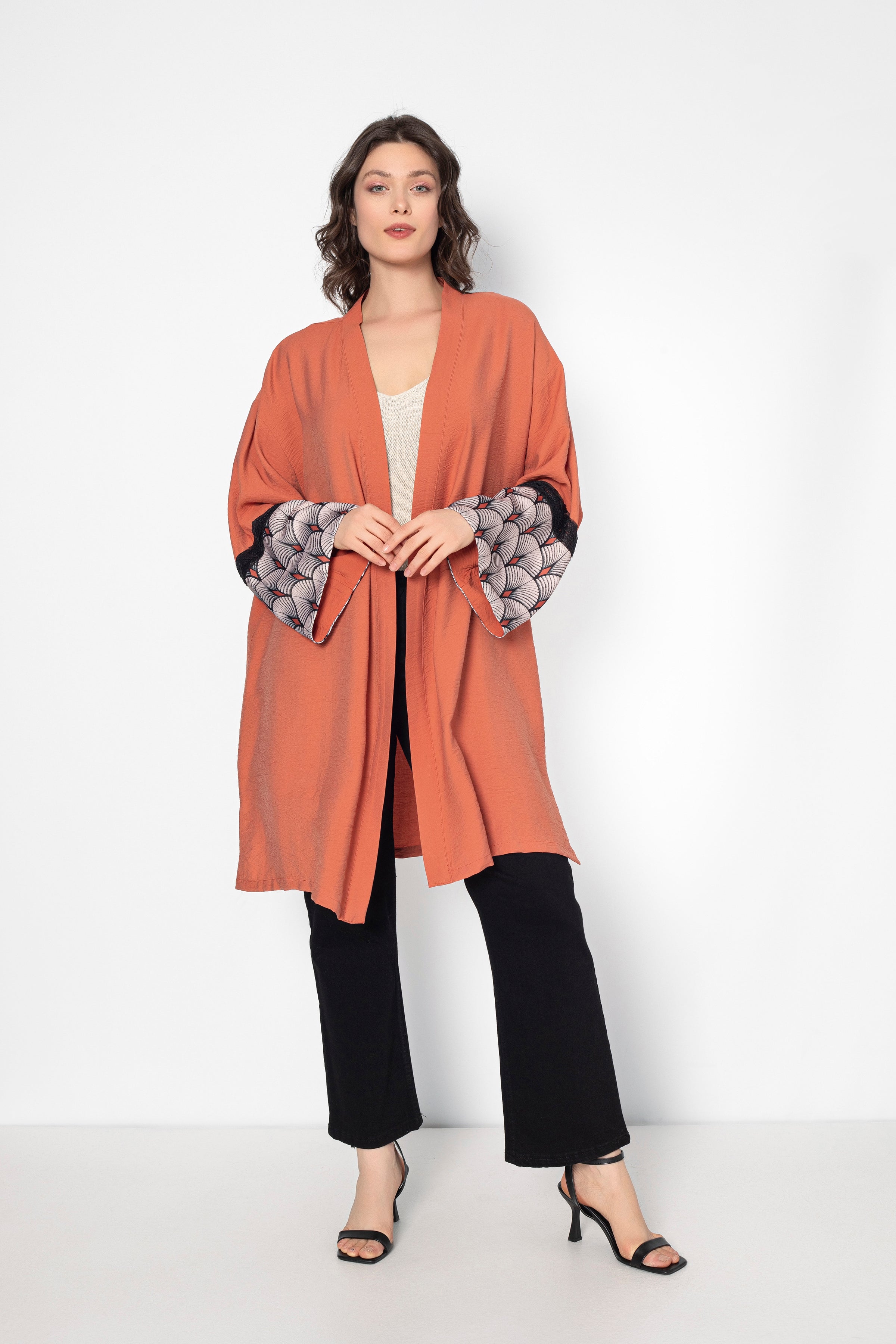 Plongez dans l'élégance intemporelle avec notre kimono Séléna, où les manches imprimées évoquent la majestuosité du motif de plume de paon.